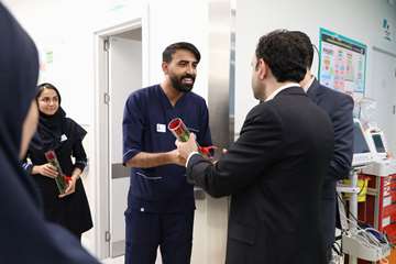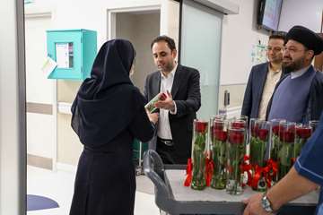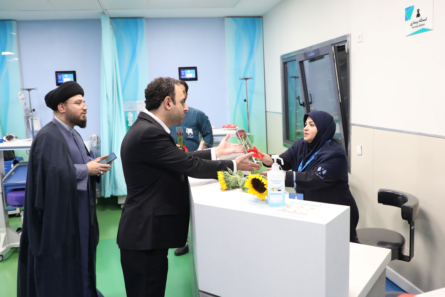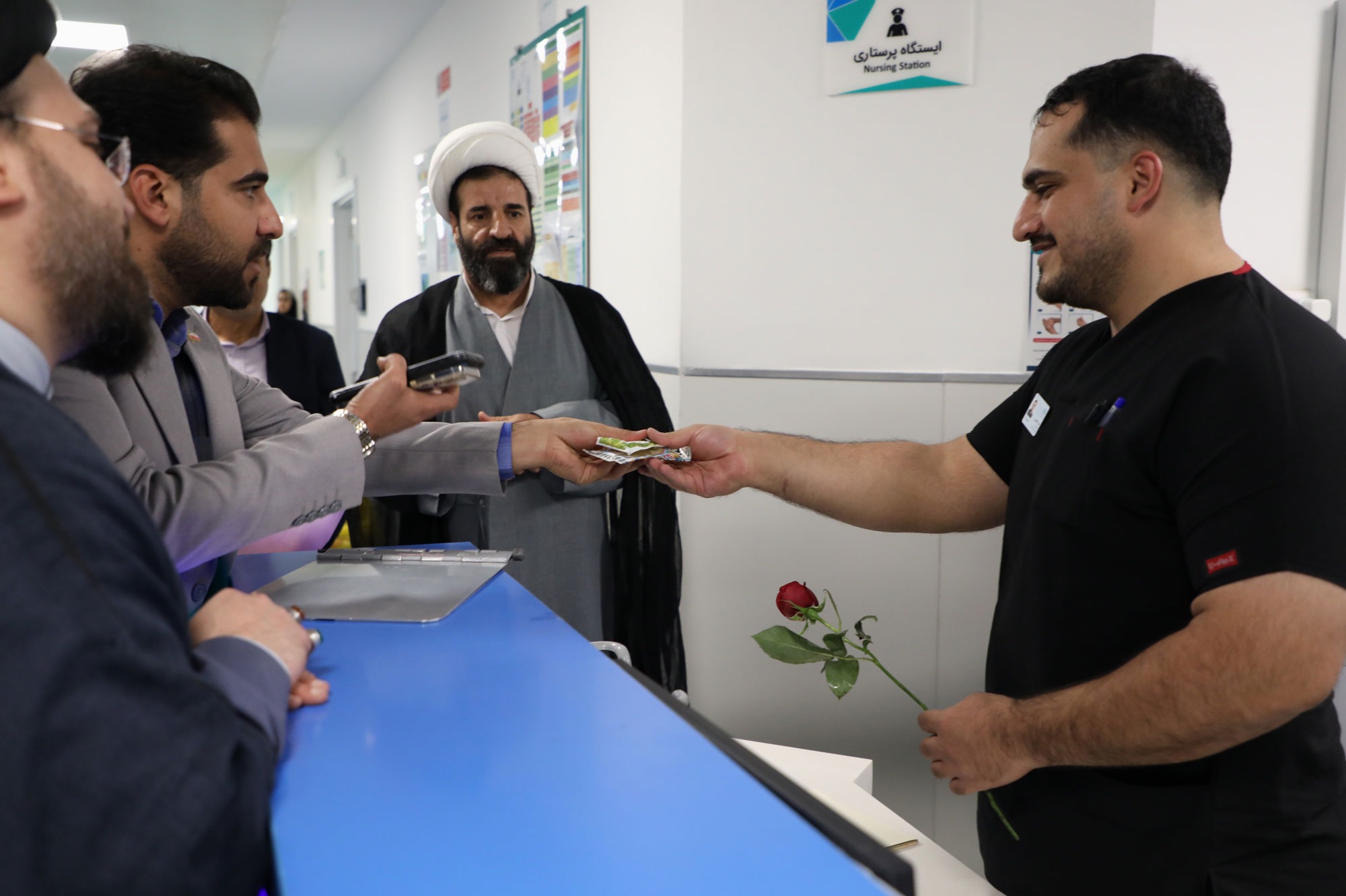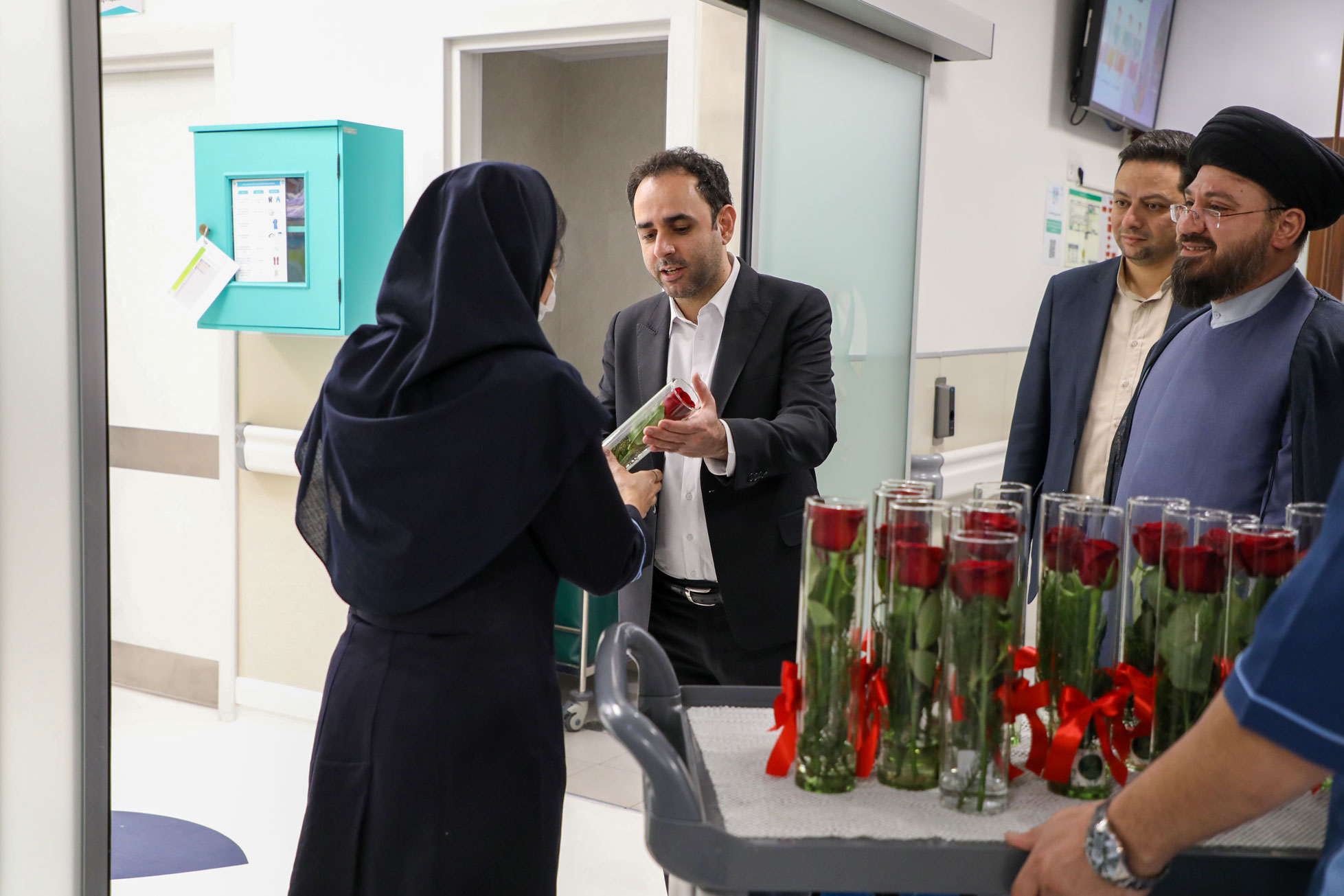 از دیگر لحظات معنوی این روز، حضور خادمیاران رضوی بود که با اهدای شاخه گل و «هدیه حضرتی» به پرستاران و بیماران، حال و هوایی معنوی به بیمارستان بخشیدند؛ در میان عبور از بخشها، عطر مهربانی و نیت آسمانیشان، بیمارستان را به گوشهای کوچک از حرم رضوی بدل کرد.